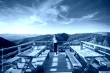 Young woman with long hair have rest in open air cafe on top of mountains and enjoy view