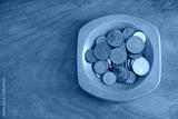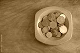 Collection coins copper pence savings in wooden bowl