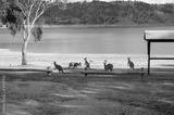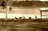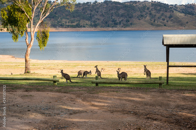Kangaroo mob near the lake in the park. Australian native animals landscape