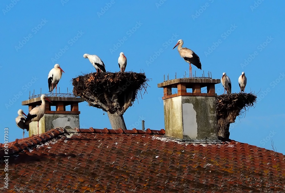 Large stork family in the nests on top of the trees and on the front house chimney and roof.