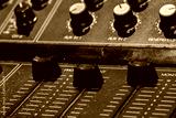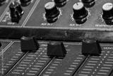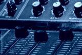 Audio sound mixer console. Sound mixing desk. Music mixer control panel in recording studio. Audio mixing console with faders and adjusting knob. Sound engineer. Sound mixer control radio broadcasting