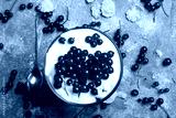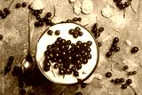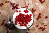 Healthy dessert with organic red currants, fresh yogurt and corn flakes. Dietary breakfast on a brown background