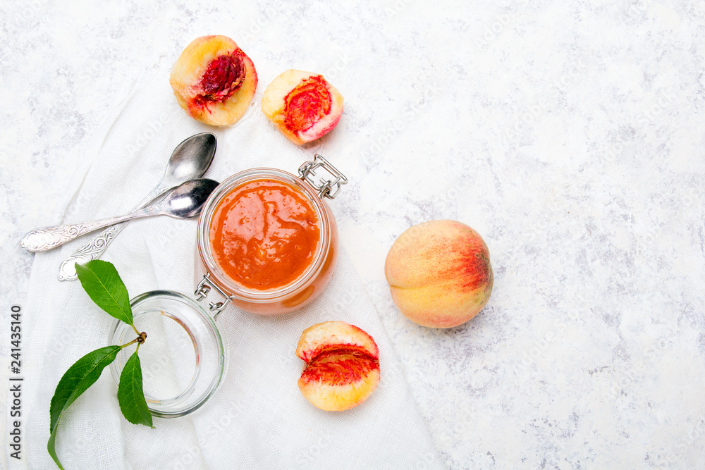 Homemade peach jam with organic fruit. Sweet preserves on a light background, , copy space
