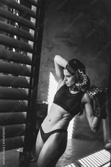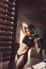 Fitness strength training workout concept background - muscular bodybuilder sexy sport girl doing exercises in gym
