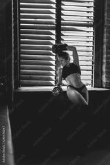 Fitness strength training workout concept background - muscular bodybuilder sexy sport girl doing exercises in gym