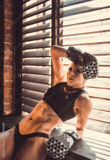 Fitness strength training workout concept background - muscular bodybuilder sexy sport girl doing exercises in gym