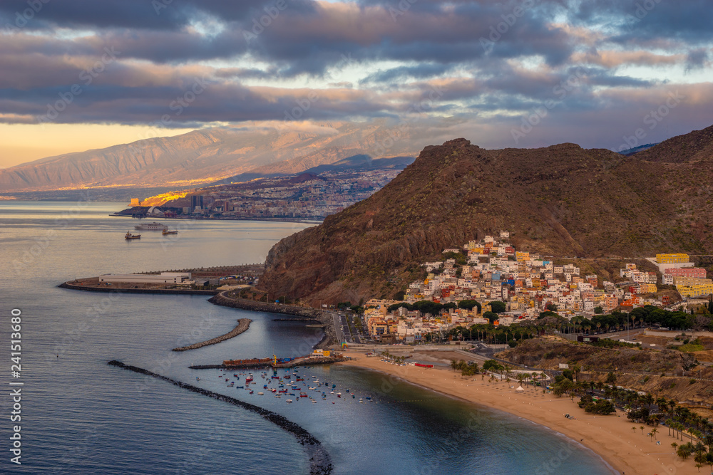 View of the Teresitas resort in Tenerife, in the distance a visible panorama of Santa Cruz and the Teide volcano