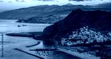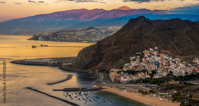 View of the Teresitas resort in Tenerife, in the distance a visible panorama of Santa Cruz and the Teide volcano