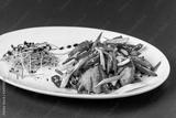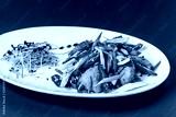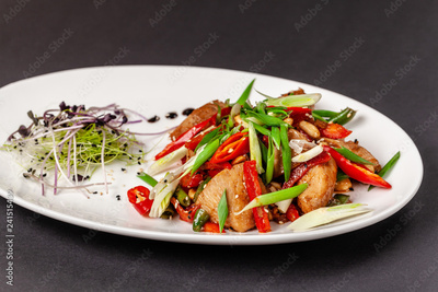 The concept of Japanese cuisine. Chicken fillet marinated in Japanese soy sauce with fresh vegetables, green beans, green onions, red pepper, sesame and microgreen. Dish on a white plate