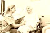 Altenpflegerin betreut Senior Frau im Rollstuhl