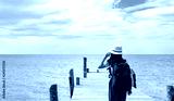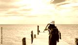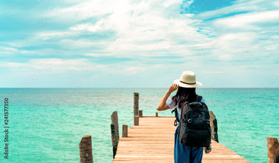 Happy young Asian woman in casual style fashion with straw hat and backpack. Relax and enjoy holiday at tropical paradise beach. Girl standing at the wooden pier of hotel in summer vacation fashion.