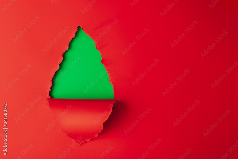 Christmas tree shape made with red and green paper. Minimal Christmas background. with copy space.