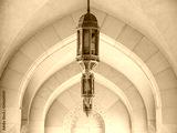 detail of arab architecture with stone arches and ornamented lantern, mosque in Muscat, Oman, Middle East