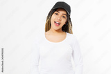 Summer t shirt design and people concept close up of young afro american woman in blank template white t-shirt. Mock up. Copy space. African hair style. front view.