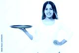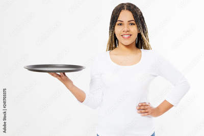 Young attractive woman holding empty pizza tray isolated on white background. Copy space and mock up. Blank template background.