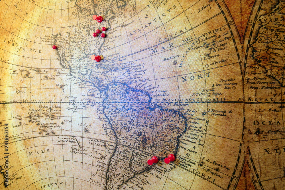 Retro and vintage map.Old illustration of ancient atlas map of world on old paper.Pin marking location on map. Adventure and travel theme background - Image