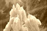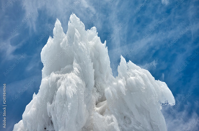 Ice formations against the sky, abstract winter background.