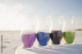Row of Clear Glass Vases filled with Colorful Sand on Small Table at the Tropical Beach During Sunset in the Sky