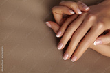 Young Female Palm. Beautiful Glamour Manicure. French Style. Nail polish. Care about Hands and Nails, clean Skin