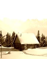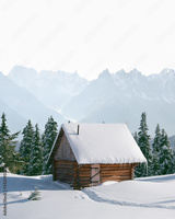Fantastic winter landscape with wooden house in snowy mountains. Christmas holiday concept