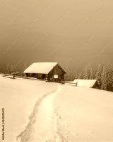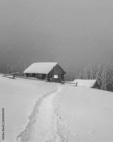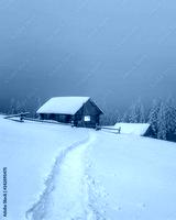 Fantastic winter landscape with wooden house in snowy mountains. Christmas holiday concept. Carpathians mountain, Ukraine, Europe