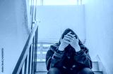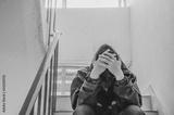 Portrait of sad young man covering his face with hands sitting on old stairs. Selective focus on hands. Sadness, despair, dark, concept