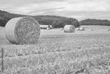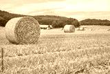 Straw round bales on a field at the end of the harvest season, color toned picture.