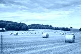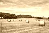 Straw round bales on a field at the end of the harvest season, color toned picture.