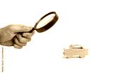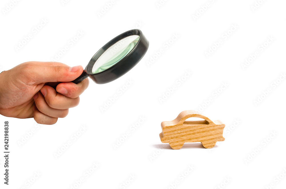 Repair and maintenance of vehicles. A wooden toy. Magnifying glass is looking at the Wooden figurine of a car on a white background. Minimalism. The concept of car insurance, buying and selling cars
