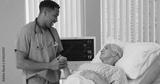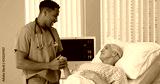 Portrait of young male nurse showing support of elderly senior patient in bed holding her hand. Registered nurse holding hand of ill female woman in hospice