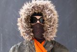 Portrait of a single male winter adventurer wearing a warm green coat with fur hood, a blue ski cap, an orange scarf and black retro style goggles
