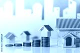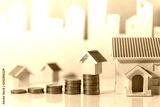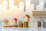 Real estate investment or Home mortgage loan rate. Property ladder concept. Coins stack and house models on the table with white city background. Money investing and business growth.