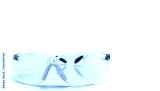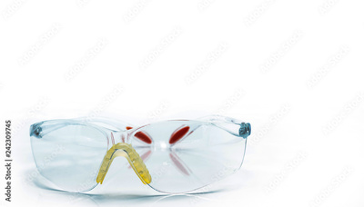 Plastic safety glasses isolated on white background. Goggles for protective eye of worker at construction site or in factory. Safety and security tools in work place. Protective eye glasses use in lab