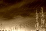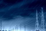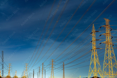 High voltage electric pole and transmission lines in the evening. Electricity pylons at night. Power and energy. Energy conservation. High voltage grid tower with wire cable at distribution station.