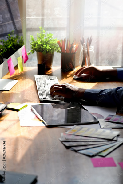 Graphic designer's working in studio workplace with computer and drawing pad tablet