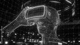 3D render, visualization of a man holding virtual reality glasses, electronic device, head surrounded by virtual data with neon green grid. Player one ready for the VR game. Virtual experience.