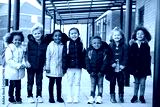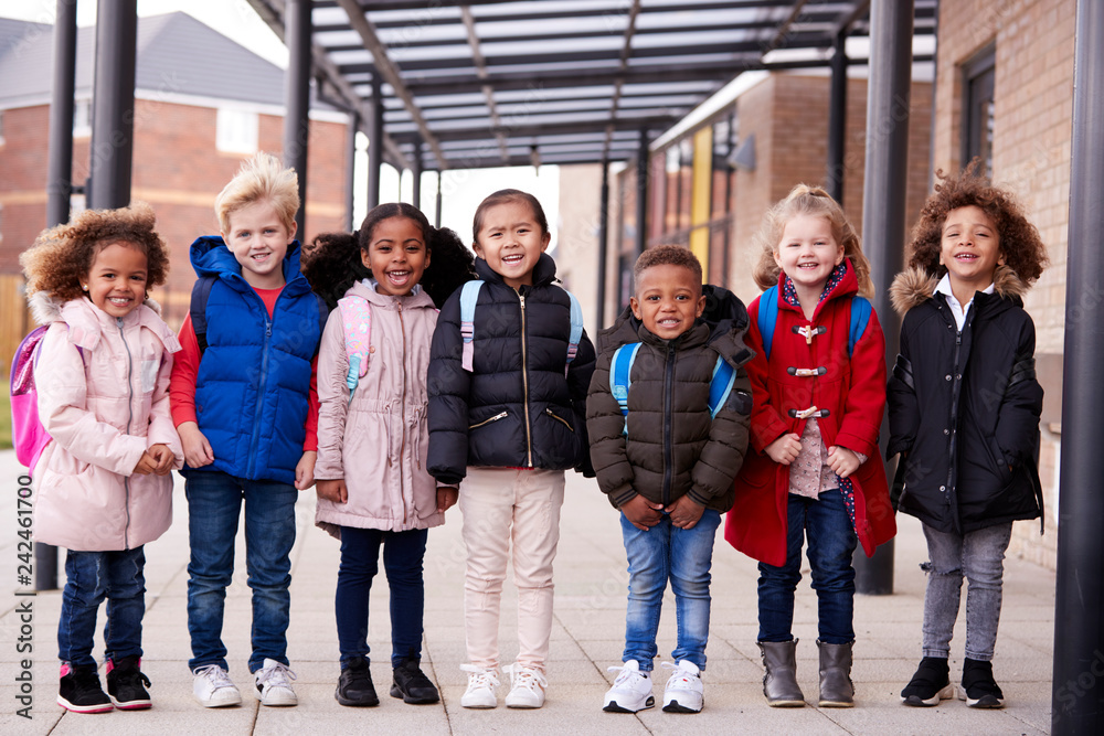 A group of smiling young multi-ethnic school kids wearing coats and carrying schoolbags standing in a row in walkway outside their infant school smiling to camera, full length, front view