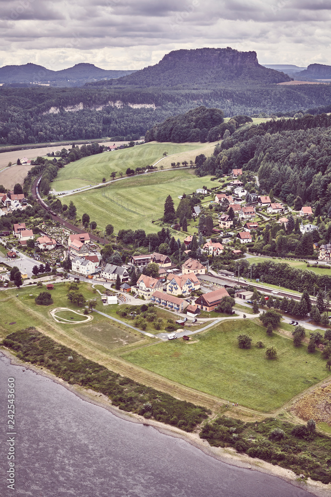 Rathen village by the Elbe River an a cloudy day, retro color toned picture, Germany.