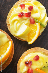Cake with cream, kiwi, pomegranate, orange and apple in a basket.