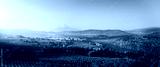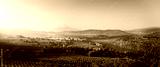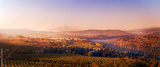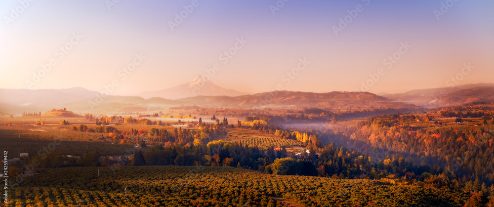 Wide aerial autumn sunrise panorama of the vineyards and orchards in the valleys below Mt Hood looking south towards the mountain
