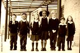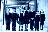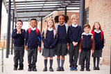 Primary school kids standing in a row on a walkway outside their school, smiling to camera, low angle