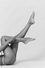 Cropped portrait of sexual woman 20s laying on floor with naked legs, isolated over beige background