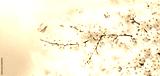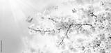 Branches of blossoming cherry against background of blue sky and fluttering butterflies in spring on nature outdoors. Pink sakura flowers, dreamy romantic artistic image of spring nature, copy space.