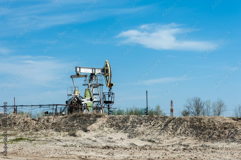 Pump jack. Extraction of oil. Petroleum concept.