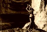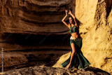 Young girl in green dress dancing the famous belly dance, in the mythical space of the canyons of the Namibe desert. Africa. Angola.