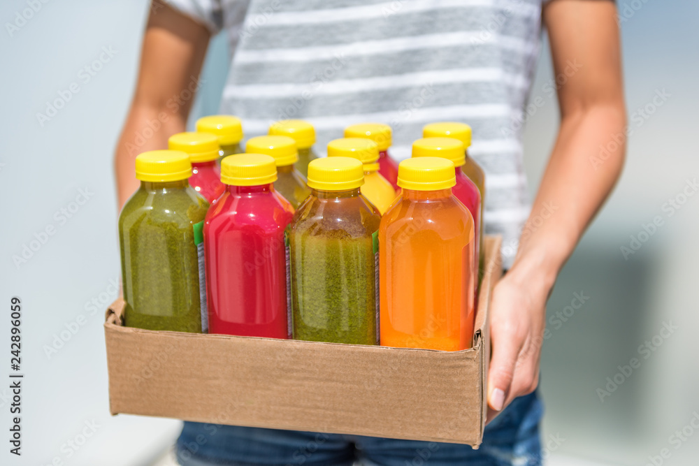 Bottles of juice with fruits and vegetables in delivery box. Cold pressed juicing bottles. Healthy juices for detox.