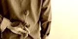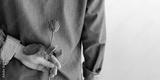 Valentine's day concept, Back side of man holding red rose on white background with copy space