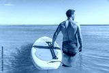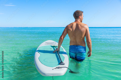 Stand up paddle boarding fitness man swimming in turquoise caribbean ocean water.