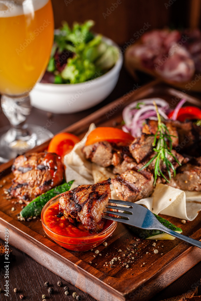 The concept of Georgian cuisine. A large wooden board with a kebab of beef, pork and chicken. Barbecue sauce and ketchup. In the background a glass of light beer with foam