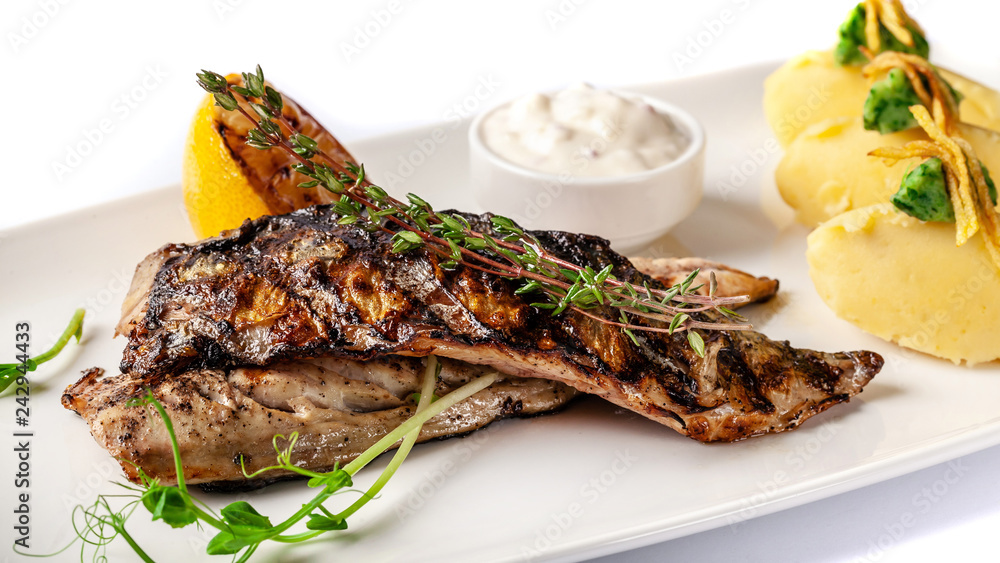 Grilled juicy mackerel, served with mashed potatoes, lemon, and tartar sauce. Microgreen. Modern pitch on a white tarekle. On a white background. beautiful serving in the restaurant.